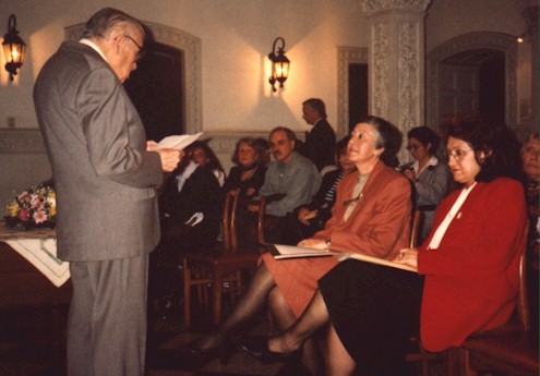 Congreso Mundial de la ISME (Ámsterdam, Holanda; 1996): Ana Lucía Frega junto a sir Frank Callaway en la presentación del libro en homenaje al Mtro. argentino Rodolfo Zubrisky, que fuera presidente de ISME (Foto: Guillermo Coronel)